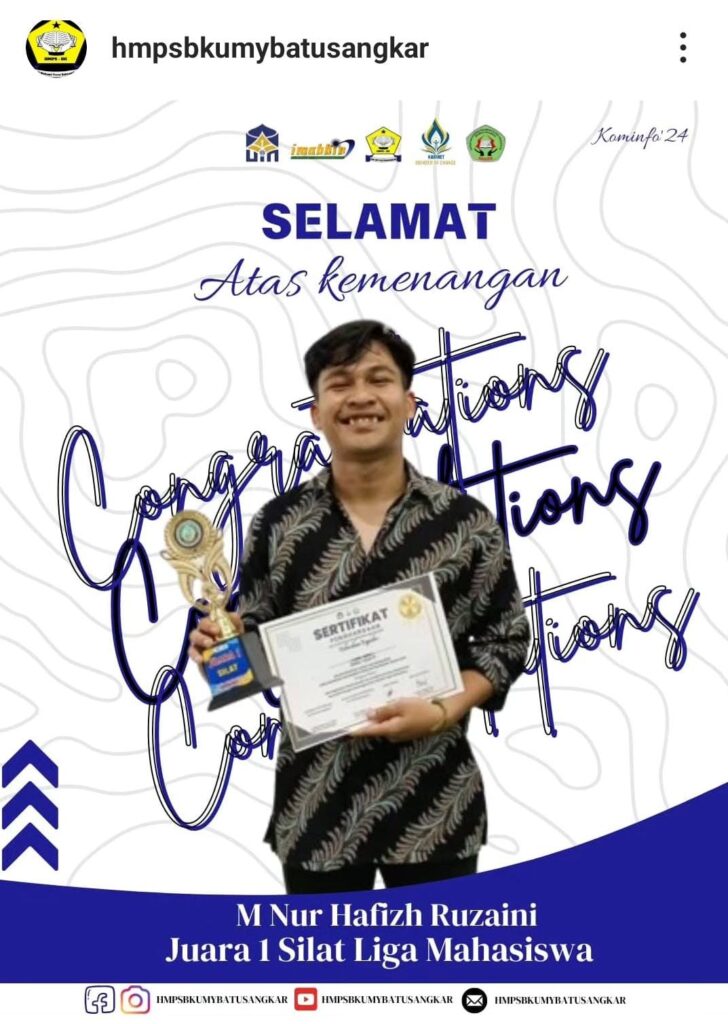 Kaprodi Ibu Dr. Rafsel Tas’adi, M.Pd dan Segenap Dosen Program Studi Bimbingan dan Konseling mengucapkan Selamat Kepada M. Hafizh Ruzaini Mahasiswa BK BP 22 Kelas C yang telah meraih Prestasi Non Akademik Juara 1 Silat dalam Liga Mahasiswa. (arsyila