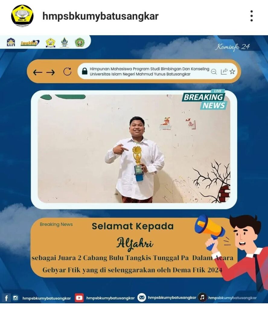 Selamat Alfahri Mahasiswa Bimbingan dan Konseling atas raihan Prestasi Non Akademik sebagai Juara 2 Cabang Bulu Tangkis Tunggal PA dalam Acara Gebyar FTIK yang diselenggarakan oleh DEMA FTIK 2024. (arsyila